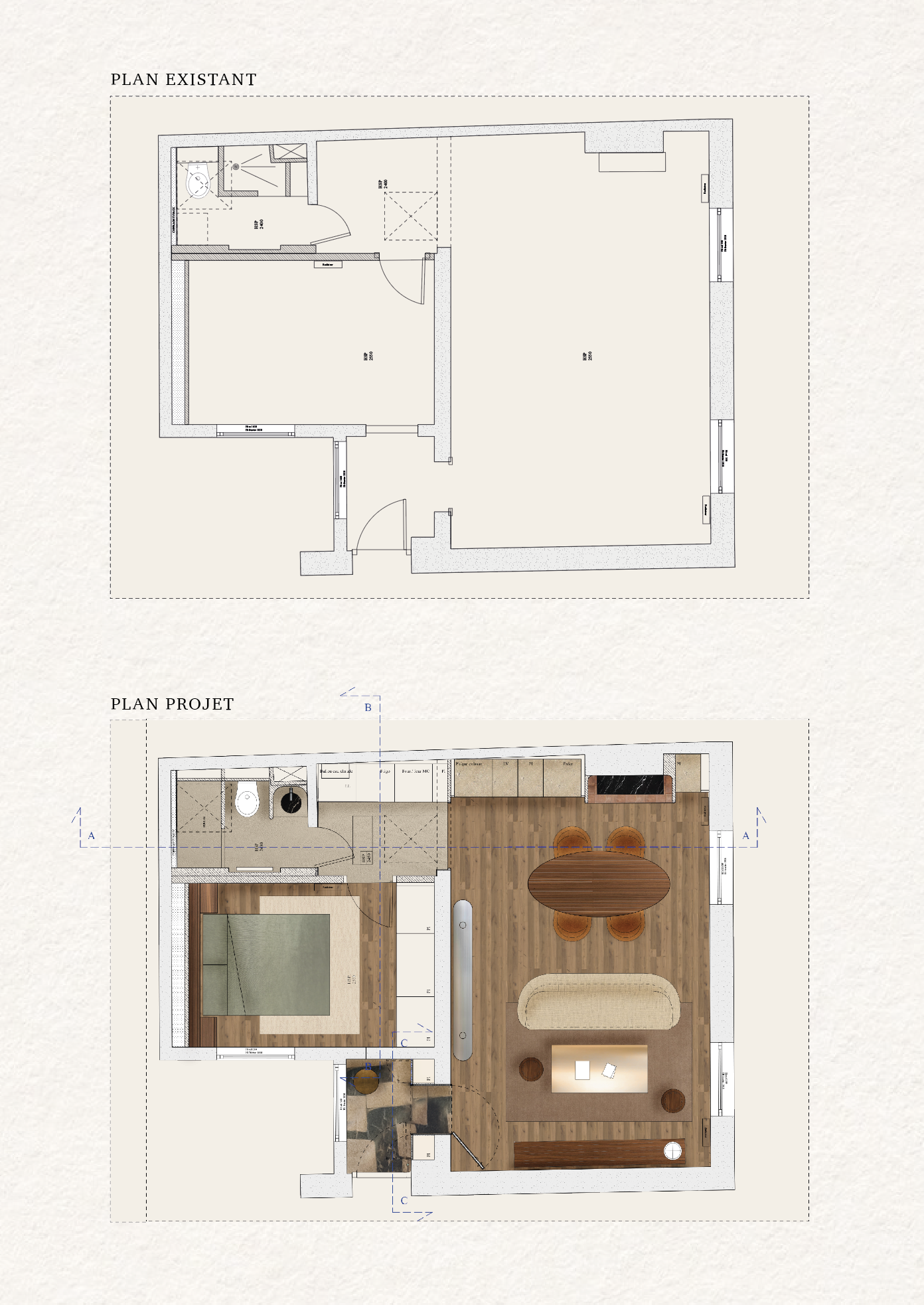 Wood, mineral finishes, and warm tones create a continuous thread, a subtile, timeless palette that naturally guides the eye and accompanies daily gestures. The apartment unfolds as a sequence of interconnected spaces, all wrapped in a soft atmosphere conducive to calm and comfort.