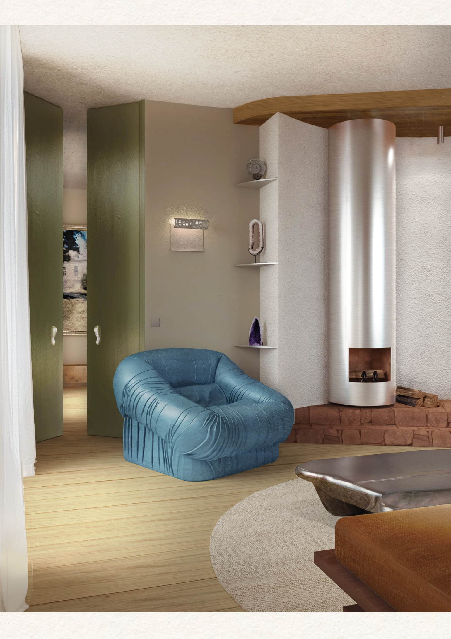 The project highlights raw and honest materials: solid wood, lime plaster, and straw marquetry. These choices reinforce the authenticity of the space while bringing softness and comfort. The layout favors fluid transitions and an emphasis on light.